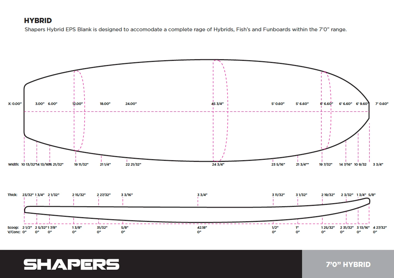 Shapers Hybrid EPS Blank is designed to accommodate a complete range of Hybrid within the 7’0” range.