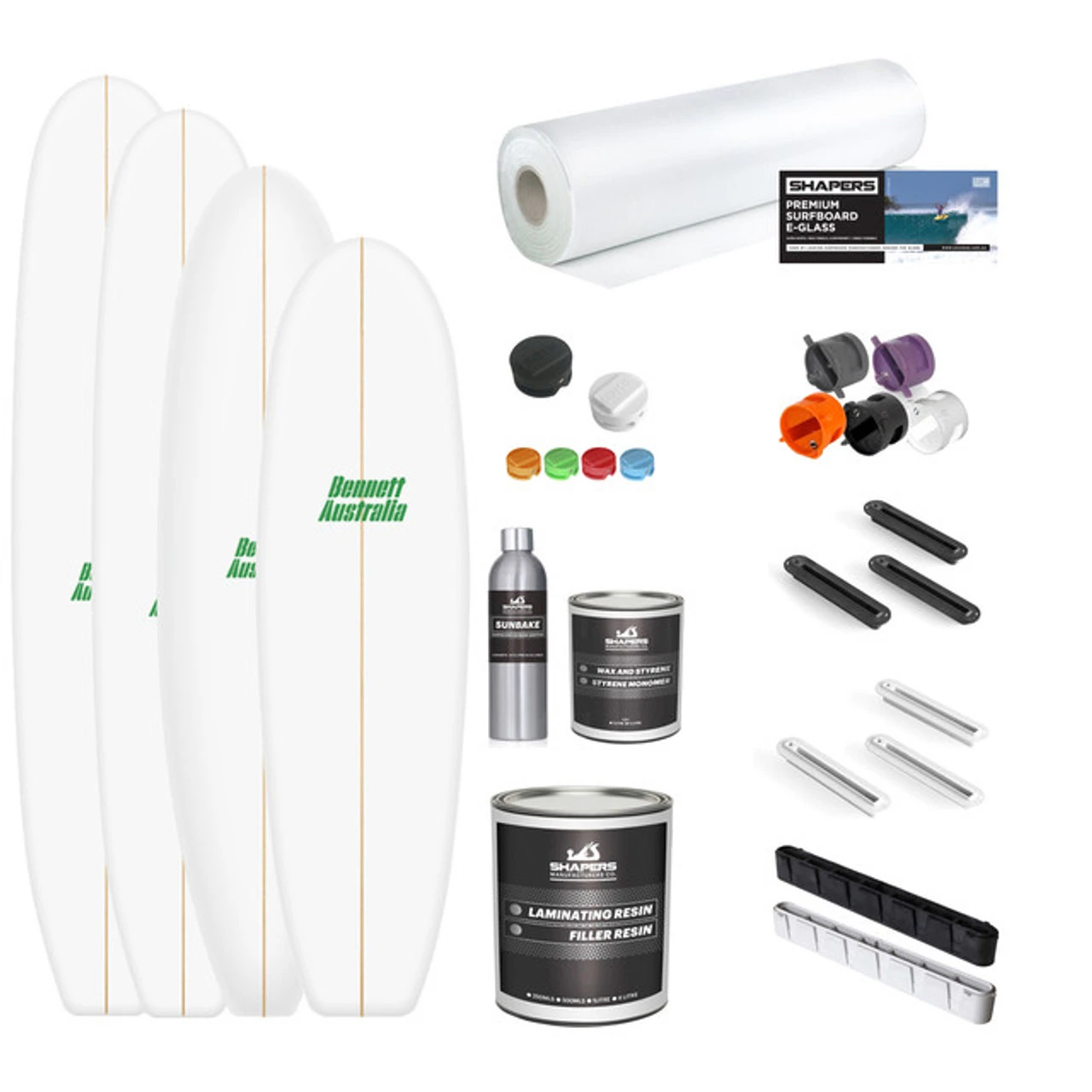The “Blank + Material Kit” includes all the materials required to laminate, filler coat and fin system installation parts required to complete your own board. The hand picked selection of materials is the same you will find on any leading board builder! Please refer to Shaping/Glassing/Sanding Tool Kits Sections for Tools required to build your own board.