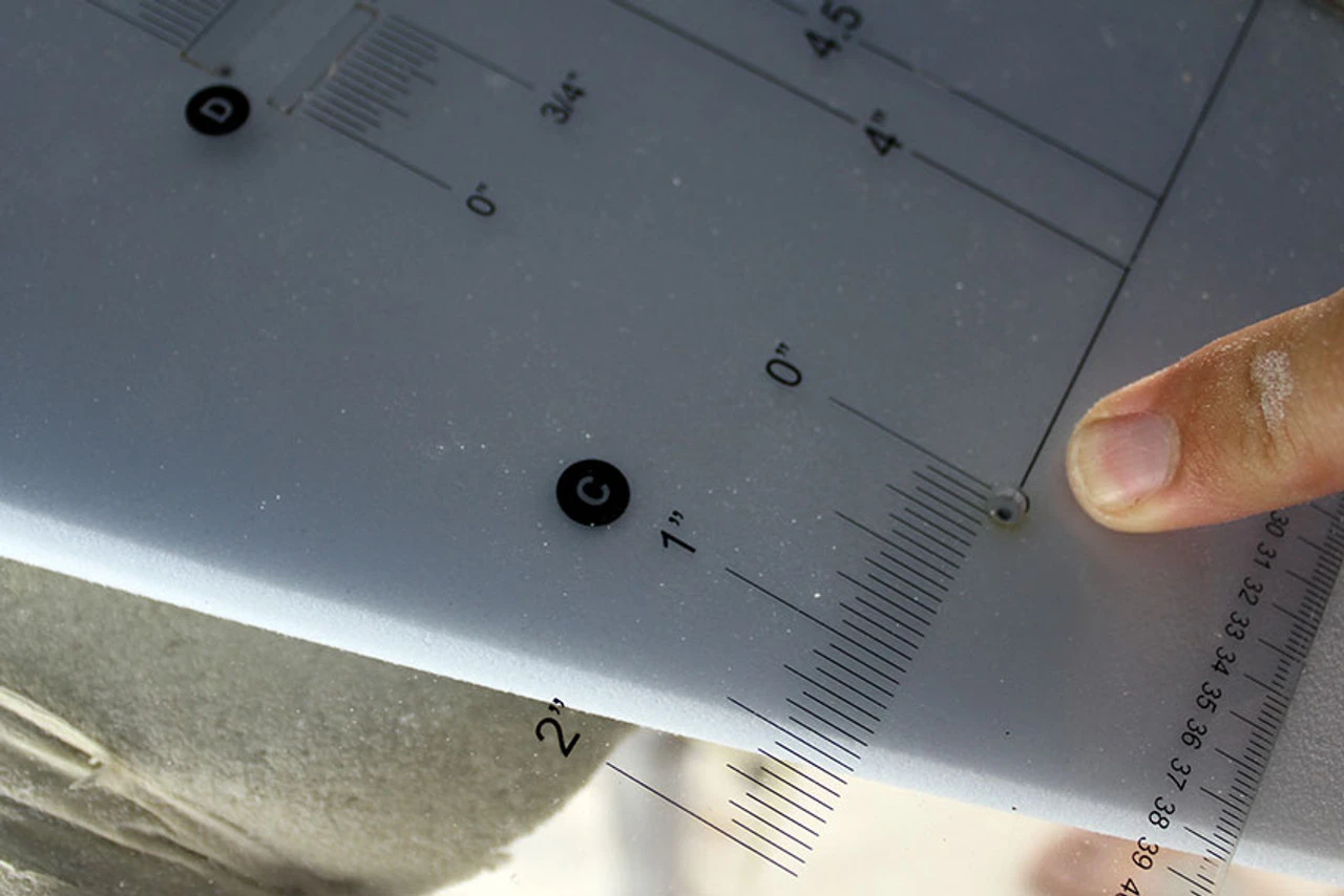 (B) Align the Shapers Squares vertical (B) lines with the stringer in order to keep the measurements true. This will allow the Shapers Square to remain level while moving the square out towards the rail to mark your fins placements.