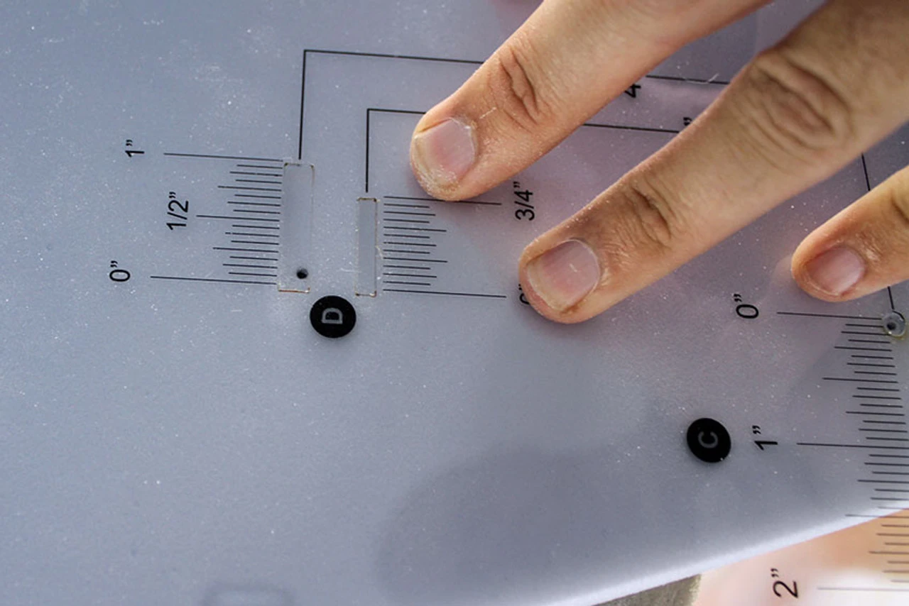 (D) Use the 4” or 4.5” cut-out (depending on the base length of your fin) to mark the front tow angle of the fin.