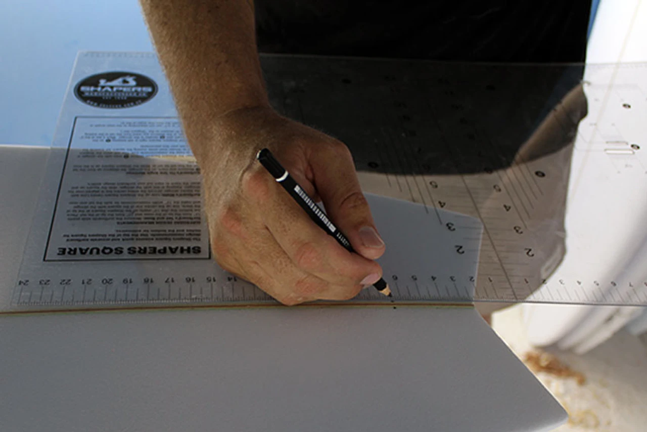 Surfboard’s Width: Line up the Shapers Square Centre Line with the blanks stringer (ensure the entire centre line is aligned over the stringer). Keeping in line with the stringer, slide the square up and down the blank to mark out your surfboard design width’s.