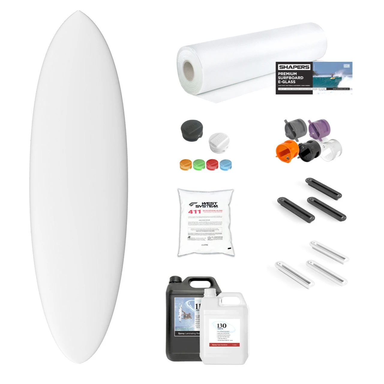The “Blank + Material Kit” includes all the materials required to laminate, filler coat and fin system installation parts required to complete your own board. The hand picked selection of materials is the same you will find on any leading board builder! Please refer to Shaping/Glassing/Sanding Tool Kits Sections for Tools required to build your own board.