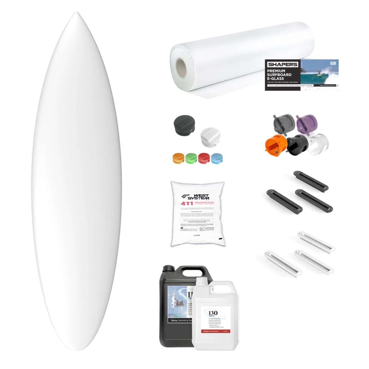 The “Blank + Material Kit” includes all the materials required to laminate, filler coat and fin system installation parts required to complete your own board. The hand picked selection of materials is the same you will find on any leading board builder! Please refer to Shaping/Glassing/Sanding Tool Kits Sections for Tools required to build your own board.