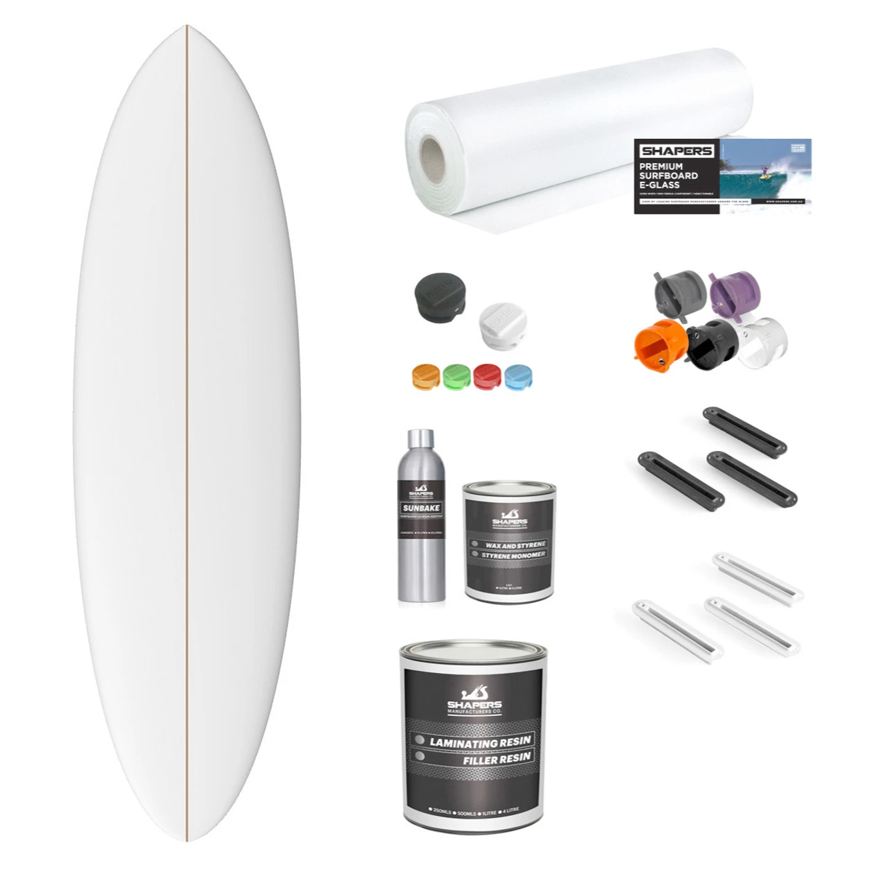 The “Blank + Material Kit” includes all the materials required to laminate, filler coat and fin system installation parts required to complete your own board. The hand picked selection of materials is the same you will find on any leading board builder! Please refer to Shaping/Glassing/Sanding Tool Kits Sections for Tools required to build your own board.